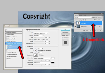 2. Doppelklick auf Textebene. 3. Abgeflachte Kanten und Relief anklicken. 4. Einstellung nach Geschmack.